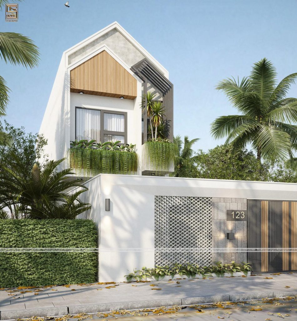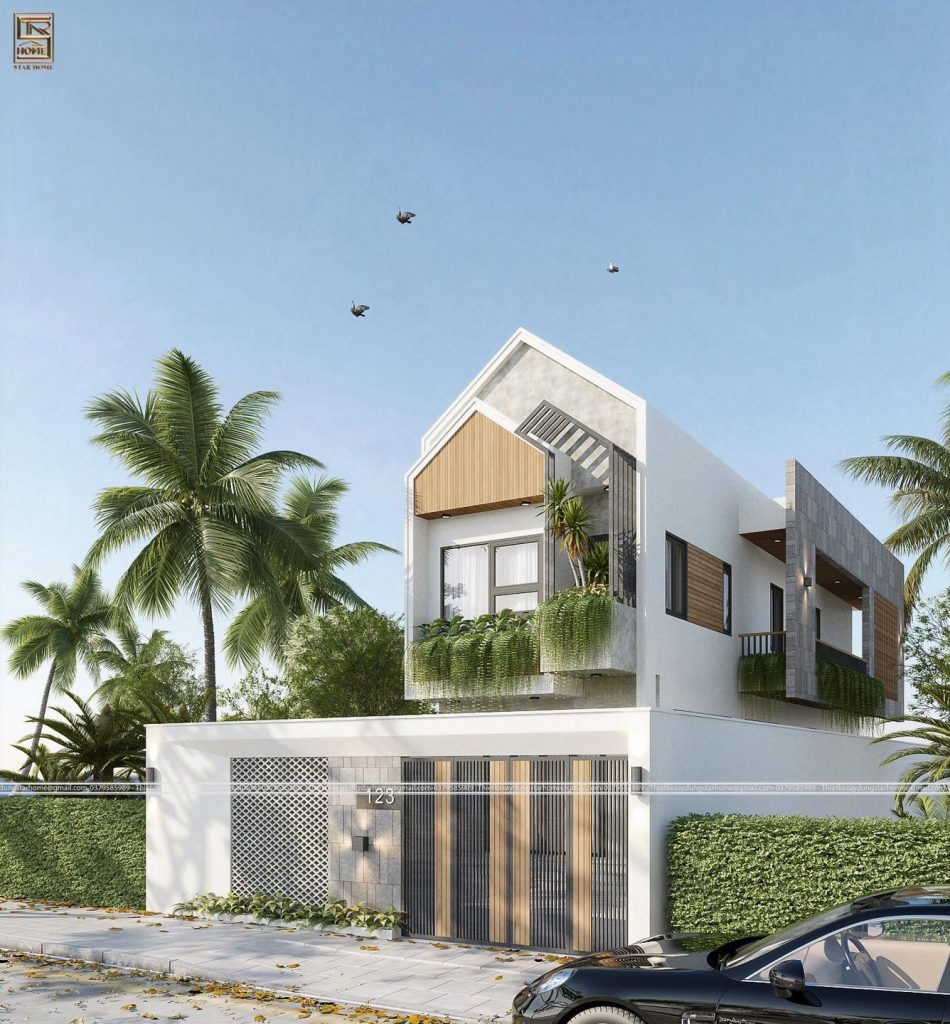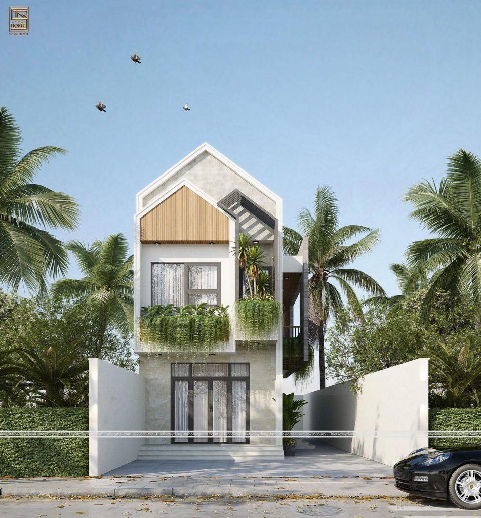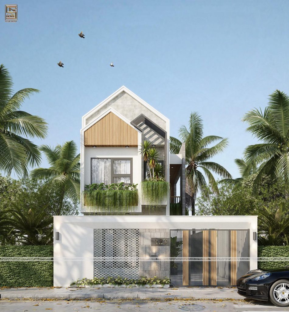 Một mẫu nhà 2 tầng có sân vườn kết hợp cây xanh,