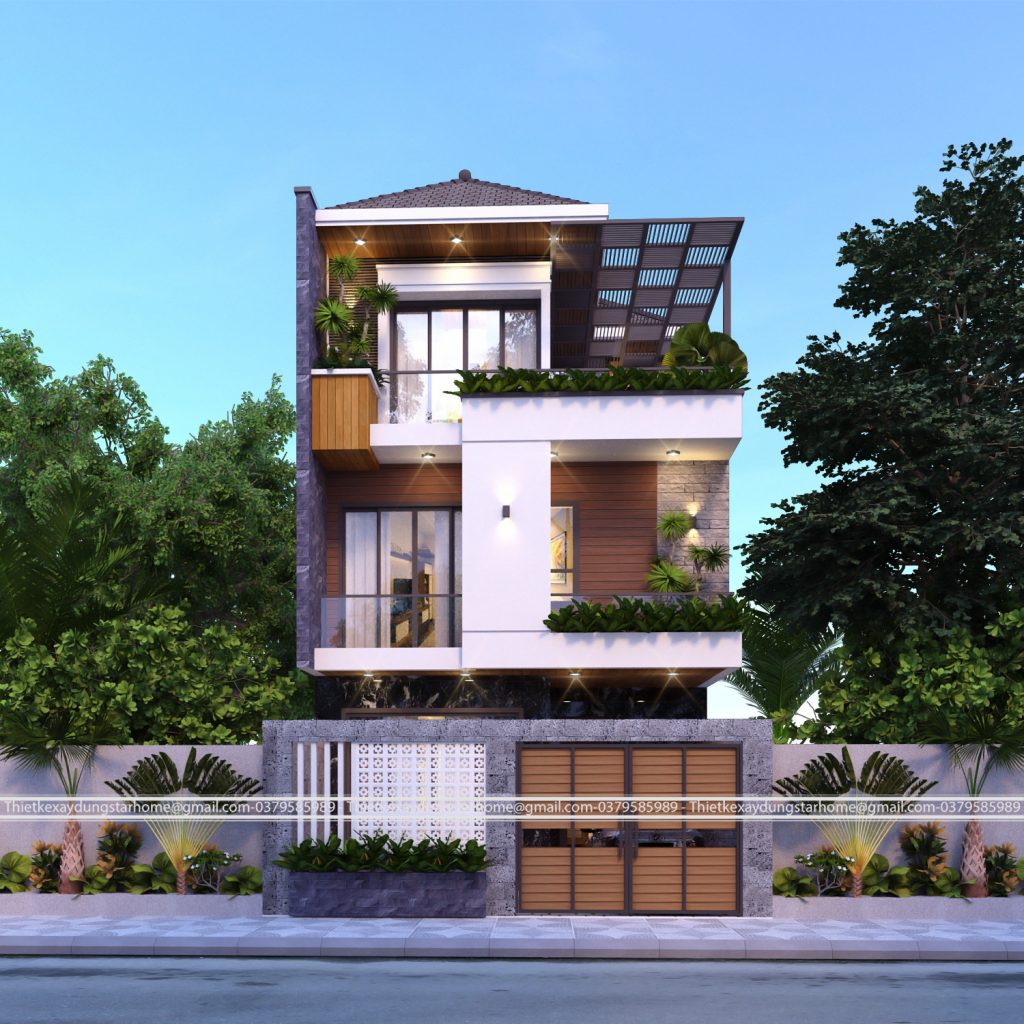 Với kiểu nhà phố 3 tầng hiện đại, sự kết hợp giữa gam màu trắng bên trong tạo không gian rộng rãi và thoáng mát, cùng với màu nâu gỗ bên ngoài tạo sự sang trọng cho ngôi nhà.Căn nhà là tập hợp không gian kiến trúc phục vụ riêng cho một gia đình, các không gian này phải thoả mãn được đời sống sinh hoạt của gia đình. Chị Mai(chủ đầu tư) là người yêu thích không gian sống hòa quyện thiên nhiên và không khí trong lành nên các vị trí của nhà liền kề đều được tận dụng bố trí các chậu cây xanh, cây phong thủy. Không gian xung quanh nhà được trang trí cây cối tạo không khí trong lành và thư giản. Tầng 3 bố trí bàn trà uống nước thư giãn, ngắm cảnh và tận hưởng không khí trong lành. Không gian đủ rộng để gia đình có thể tổ chức các bữa tiệc nhỏ buổi tối cùng gia đình, bạn bè.