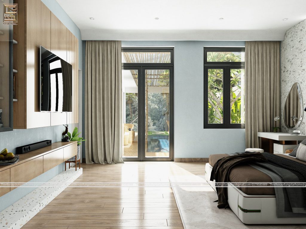 -Phòng ngủ master có cửa chính hướng ra ngoài sân vườn đón ánh nắng bình minh mỗi bữa sáng, bên cạnh đó vừa có tác dụng có thể nhìn rỏ được những hoạt động vui chơi ngoài hồ bơi nếu như gia đình bạn có con nhỏ. Vừa đẹp lại tiện nghi