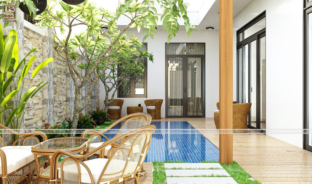 và phong cách hiện đại. Không quá to lớn như những mẫu biệt thự cao tầng, nhưng biệt thự 1 tầng có hồ bơi hiện đại với mặt tiền thoáng và tiện nghi đã làm không ít gia chủ yêu thích.